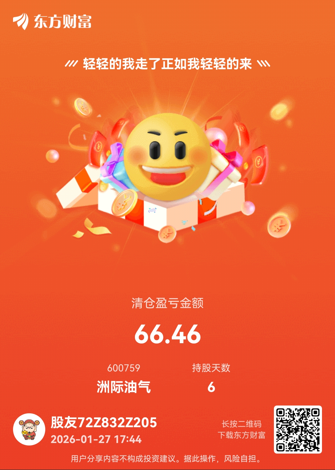 $洲际油气(SH600759)$ 在低位总投资1550元,6天也是一天盈利10元,我赌的是假新闻。网上到处都是美国伊朗冲突,所以你懂的,第一个涨停板,抛了,没想到明天还有一个涨停板,果然第3天,也就是星期一就开始出货了,现在套住的人应该还有