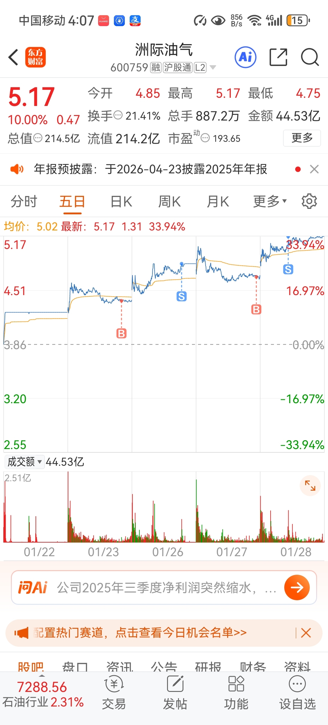 $洲际油气(SH600759)$ 这几天的操作,明天可能要回吐了