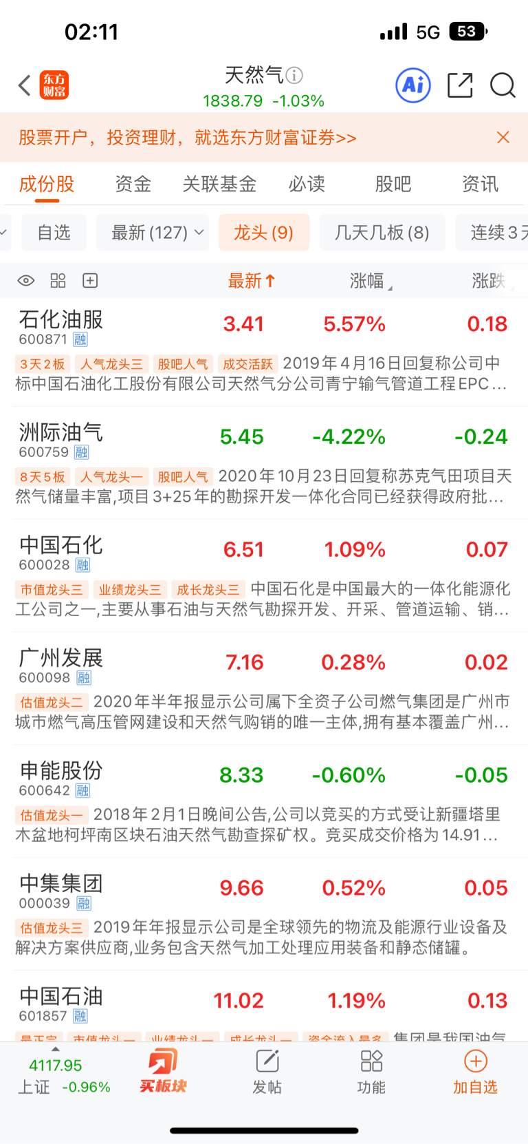 天然气概念里的龙一,市值最小,股价第二小,应该死不了