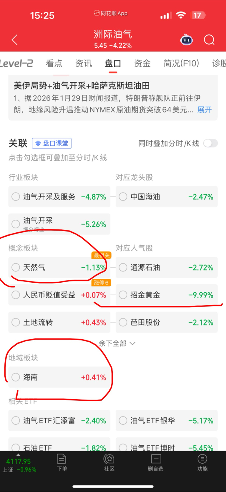 $洲际油气(SH600759)$ 这个股票是关于和天然气的,但是那个黄金白银下跌那个中东局势也会影响他,所以说周五他就冲高回落了,只要那个黄金白银不再继续下跌,然后咱们还是有预期的