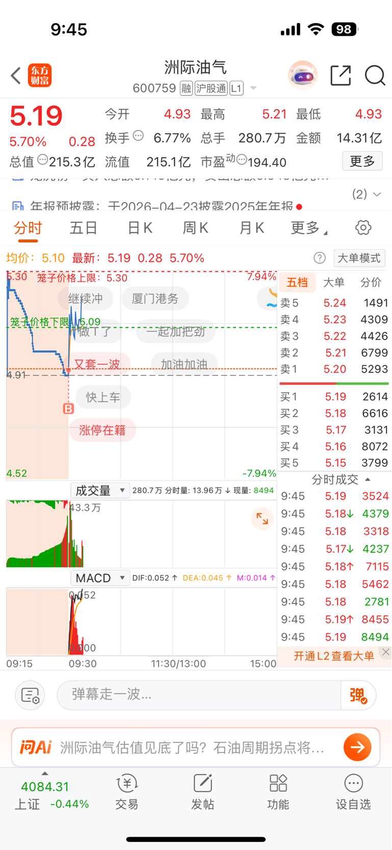 $洲际油气(SH600759)$ 4.80还想再低吸一笔的,看来不给机会了