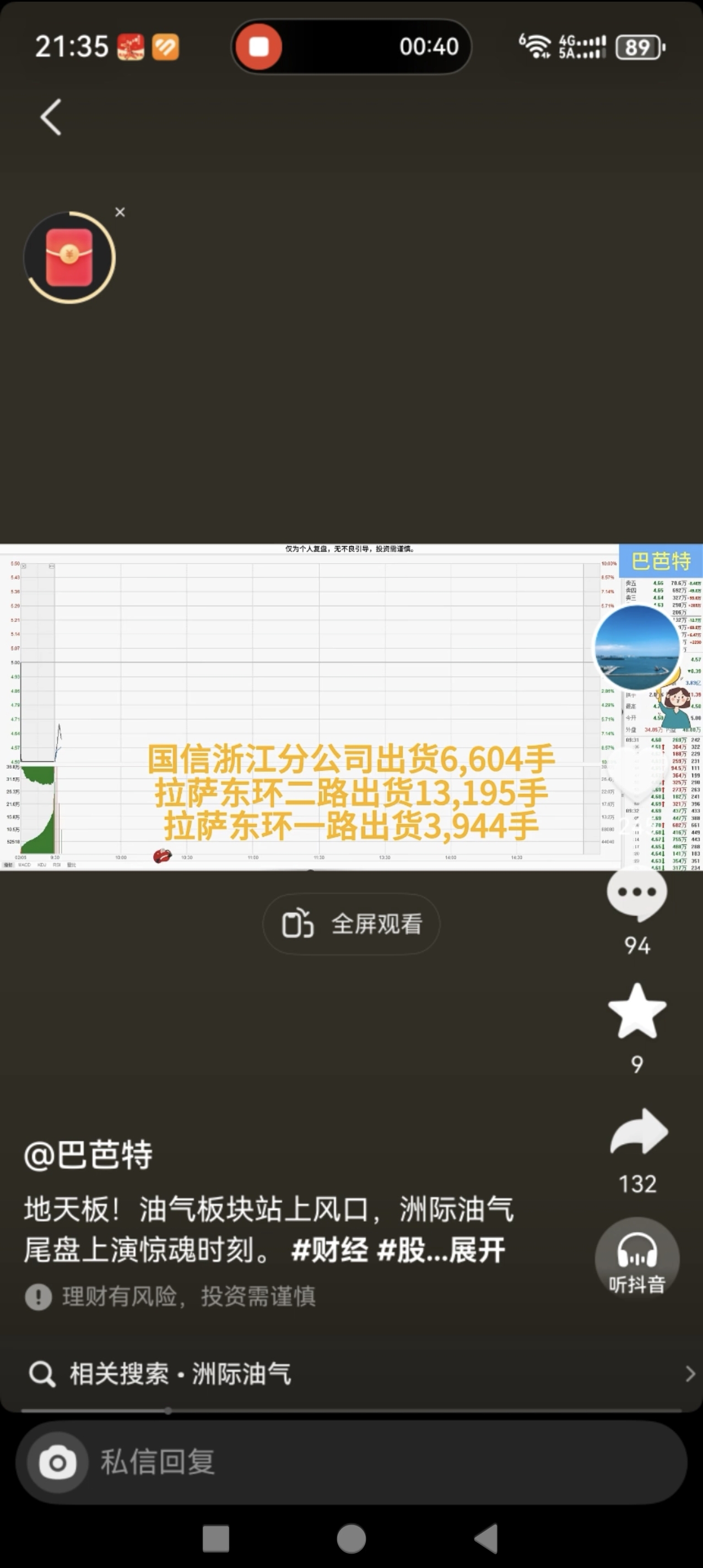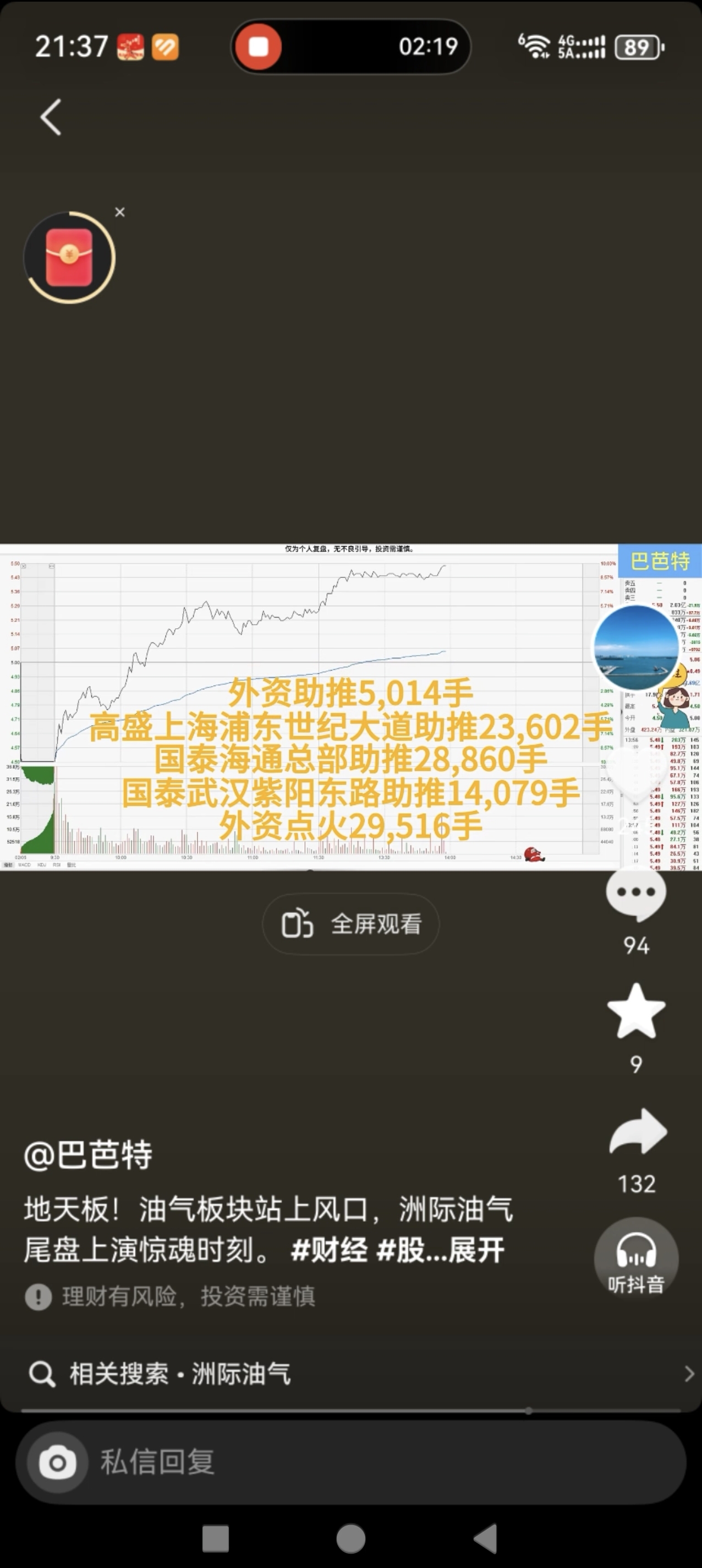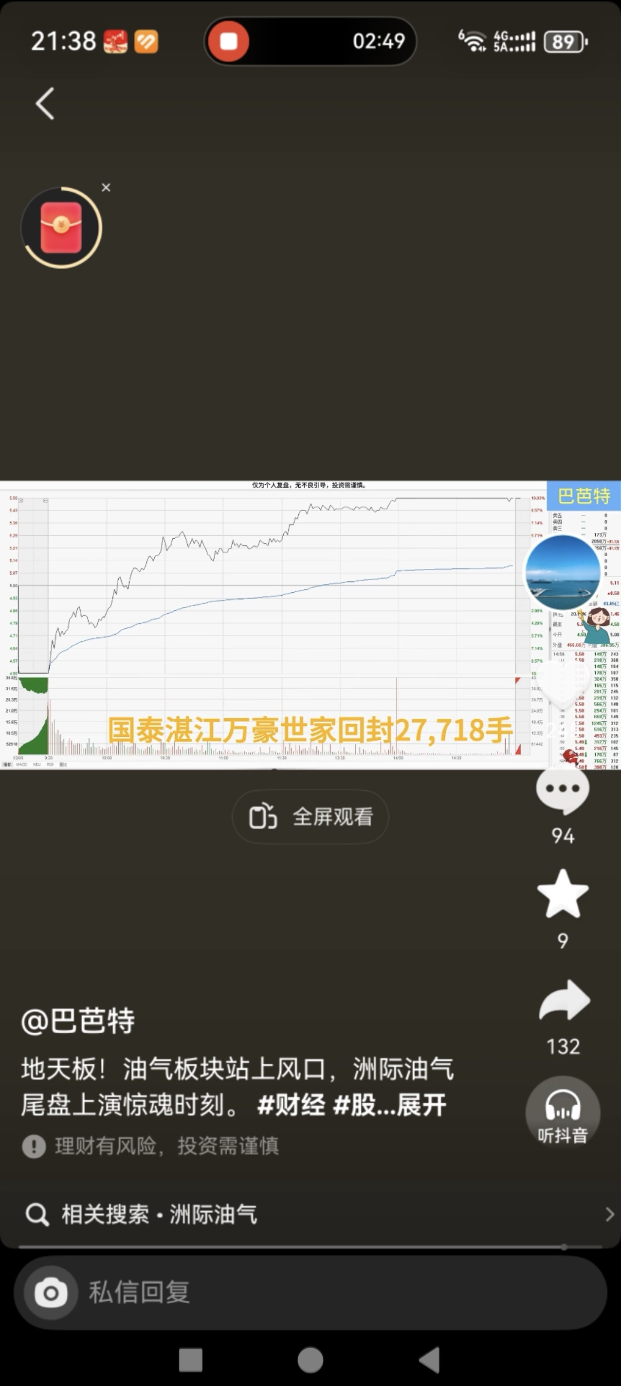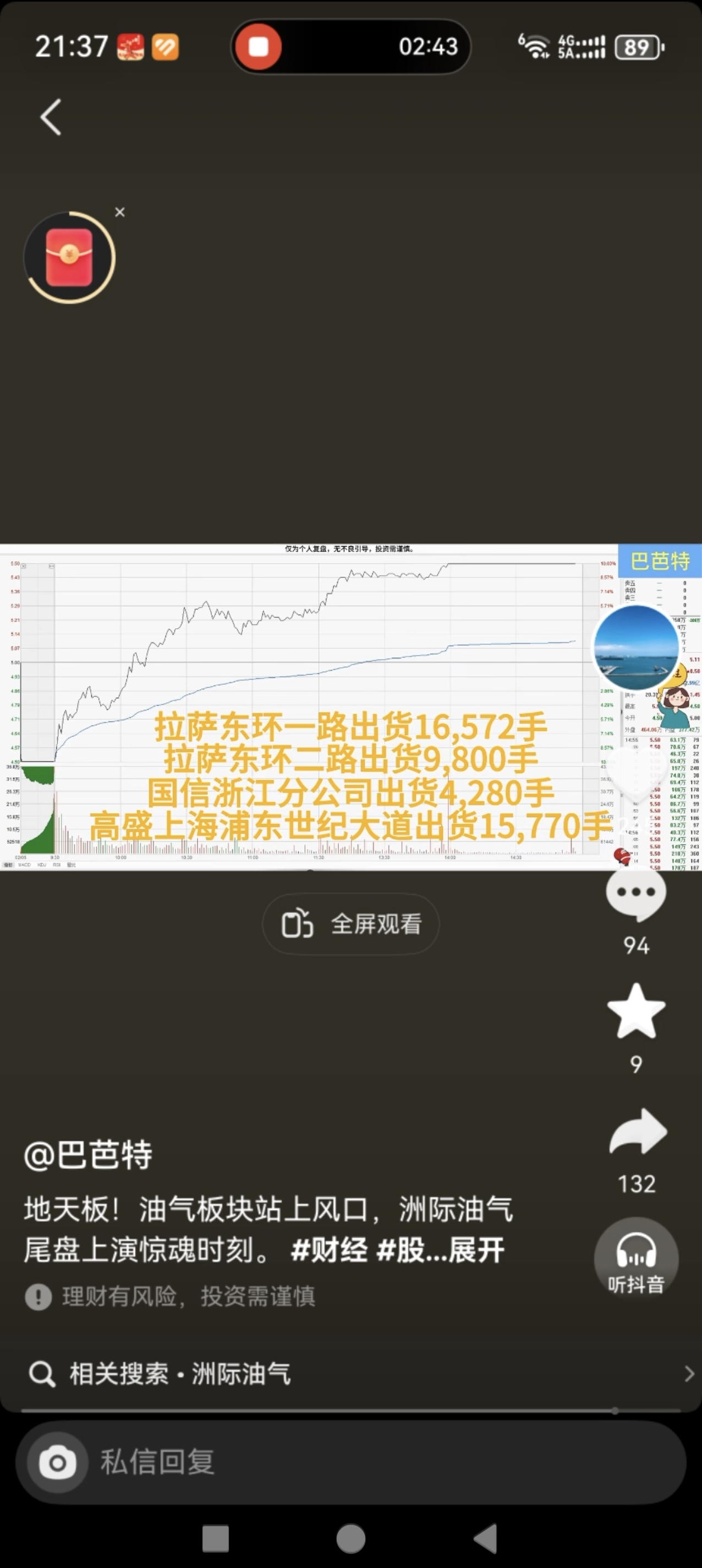 $洲际油气(SH600759)$ 总结一下今天的情况,集合竞价跌停疯狂吃筹码,水下-5左右散户跑,主力吃,下午9个点左右引发合力,各路大神强势封板,尾盘家人们恐慌出逃,并不是主力撤单!外资,紫阳东路等强势回封上演地天板!尾盘家人们出逃还吓走我一半筹码,家人们是真可恶!上图