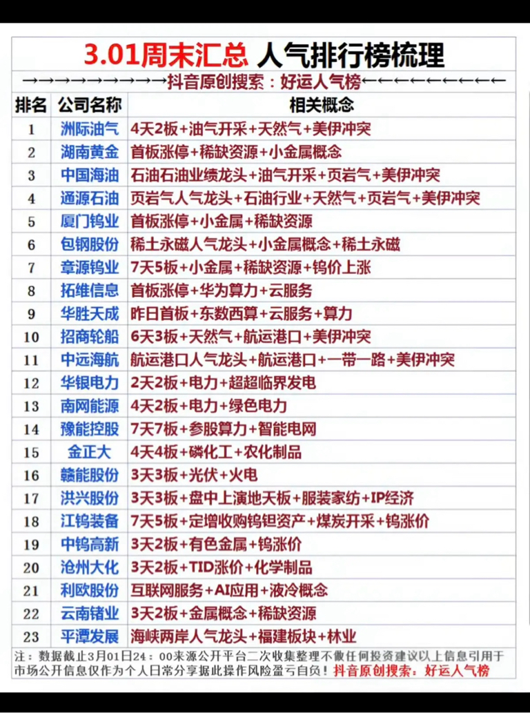 3.1周末人气热搜排行榜!1.油气相关2.云服务,算力3.航运港口,美伊冲突4.