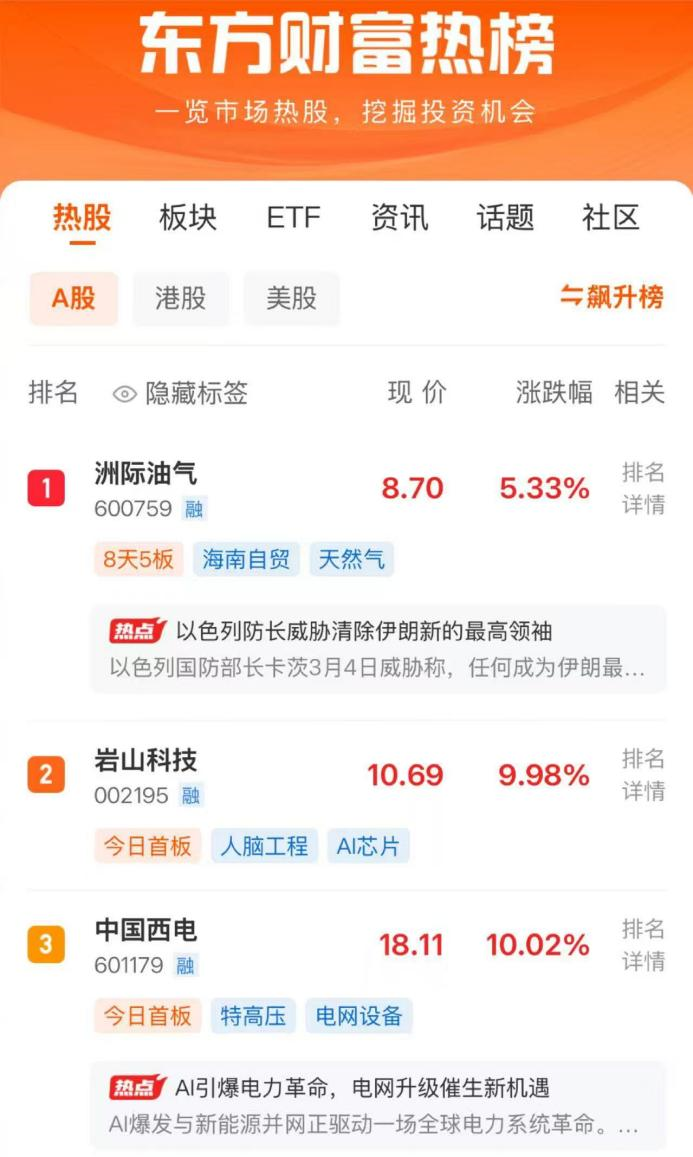 3月5日,两市震荡反弹,创业板指领涨。东方财富热榜前三的股票中,洲际油气位列第1,岩山科技位列第2,中国西电位列第3。