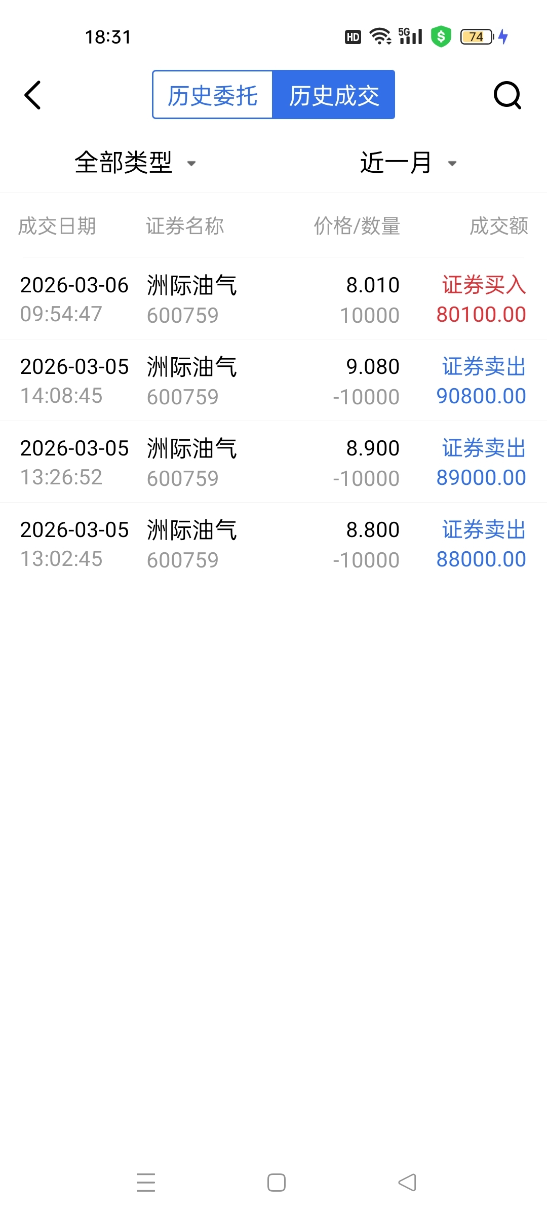 $洲际油气(SH600759)$ 3月5日(星期四)分三批走了后,3月6日只接回来了三分之一,下周一如果大涨,赚钱肯定是开心的,甭管赚多赚少(概率65%);如果继续大幅震荡,就拿这点仓位做一下T,看能不能降低一点成本(概率34%);如果还大幅下跌,则继续加仓,直至加满(概率1%)。