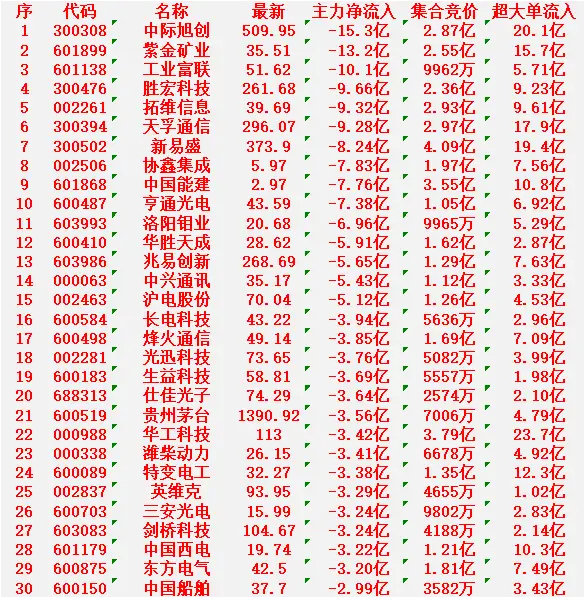 中际旭创:最新价 509.95元,净流入 -15.3亿元