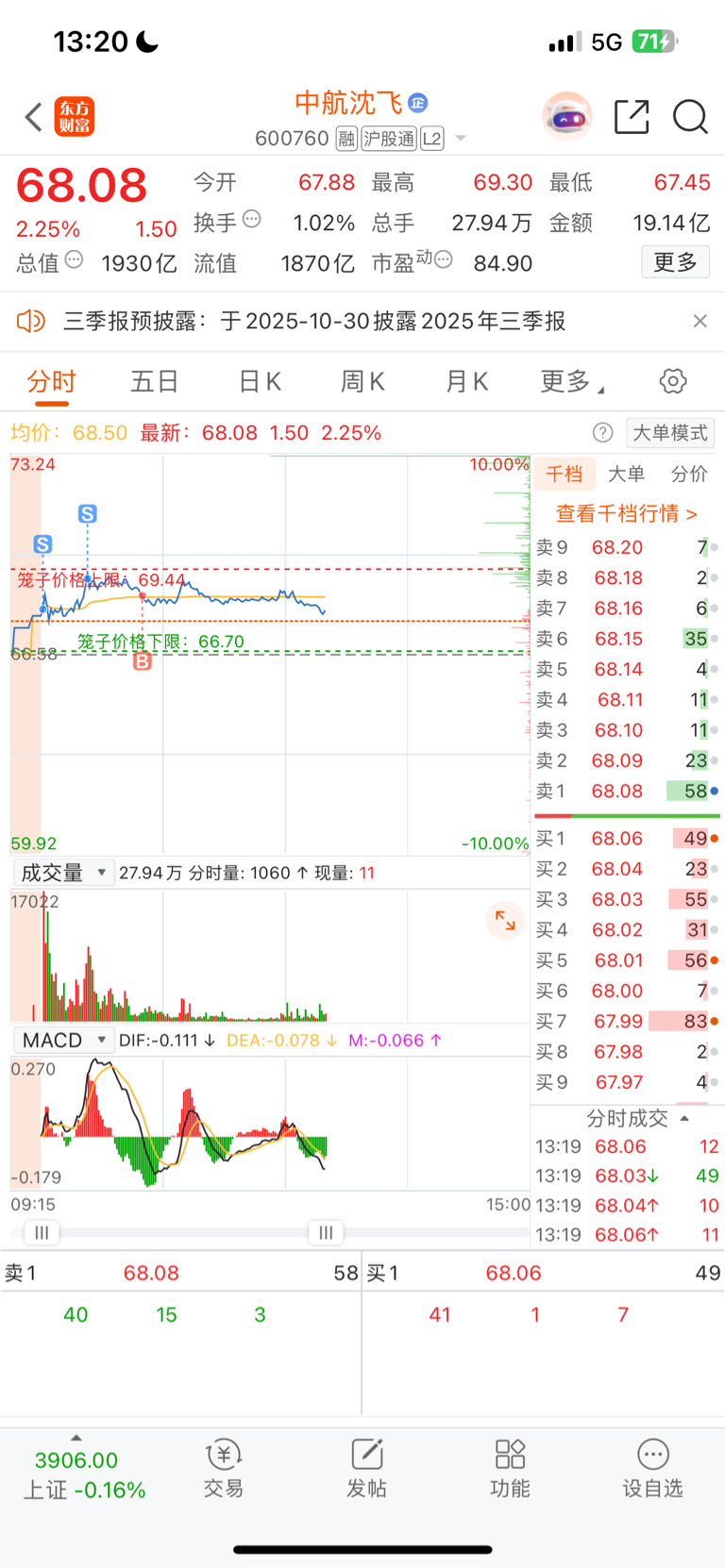 $中航沈飞(SH600760)$ 卖了一半,明天65块再接