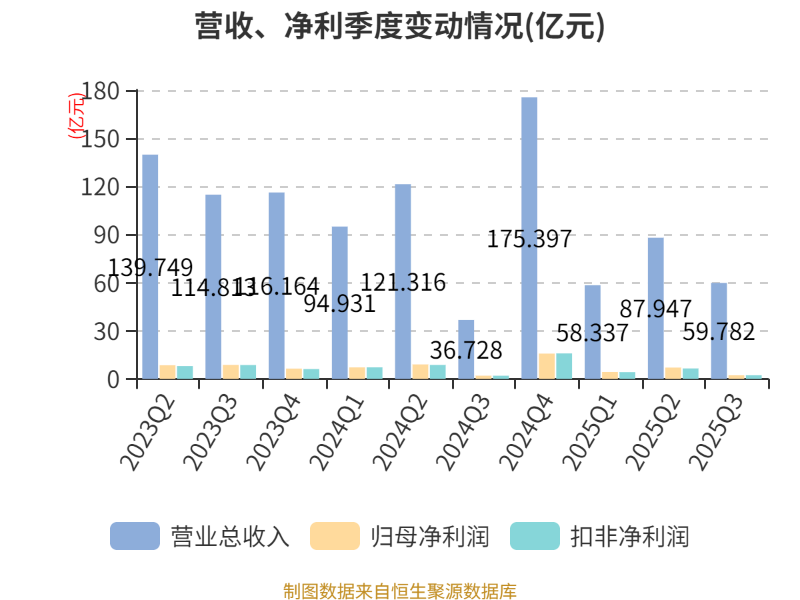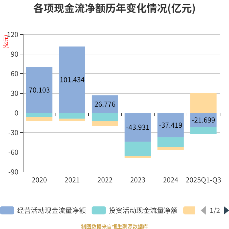 2025年前三季度,公司经营活动现金流净额为-21.7亿元,同比增加37.19亿元;筹资活动现金流净额30.19亿元,同比增加38.4亿元;投资活动现金流净额-10.32亿元,上年同期为7886.44万元。