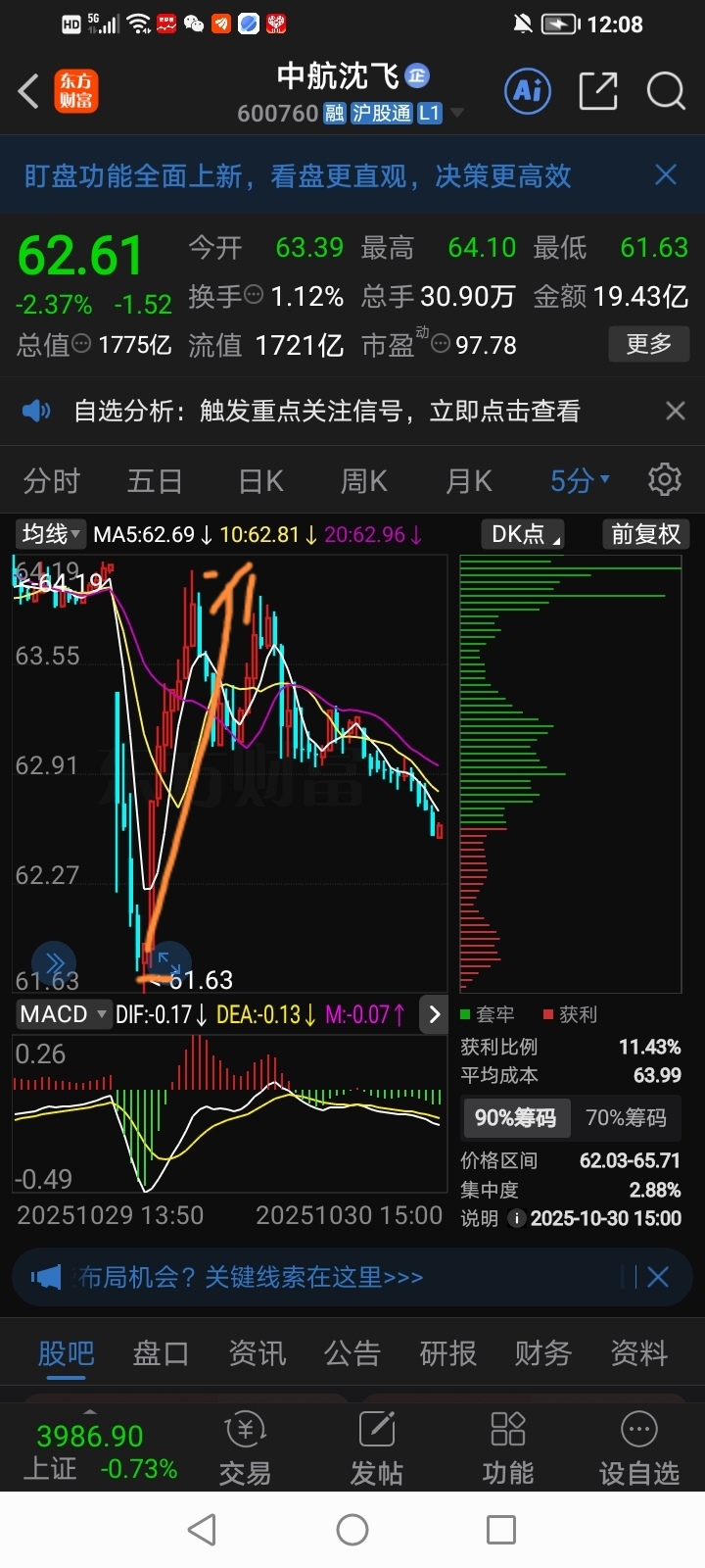 $中航沈飞(SH600760)$ 看5分钟K线筹码图,上午强打压杀跌底部,然后就快速拉升差点返红,午后又随着大盘指数慢慢下滑,抛出的全是小散户单为主,明显主力机构就是强势洗盘高抛低吸筹码!