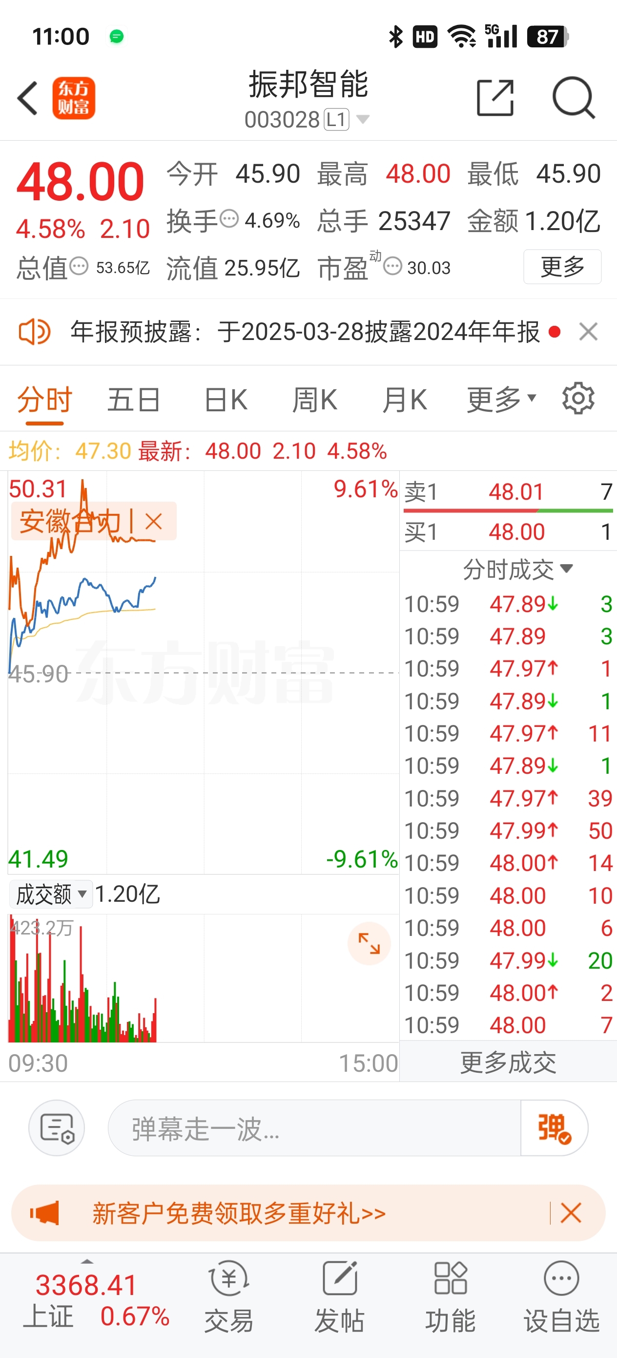 星期一那天合力切到振邦赚了七个点的差价之后这两天已经被合力超过三个点,利润空间只