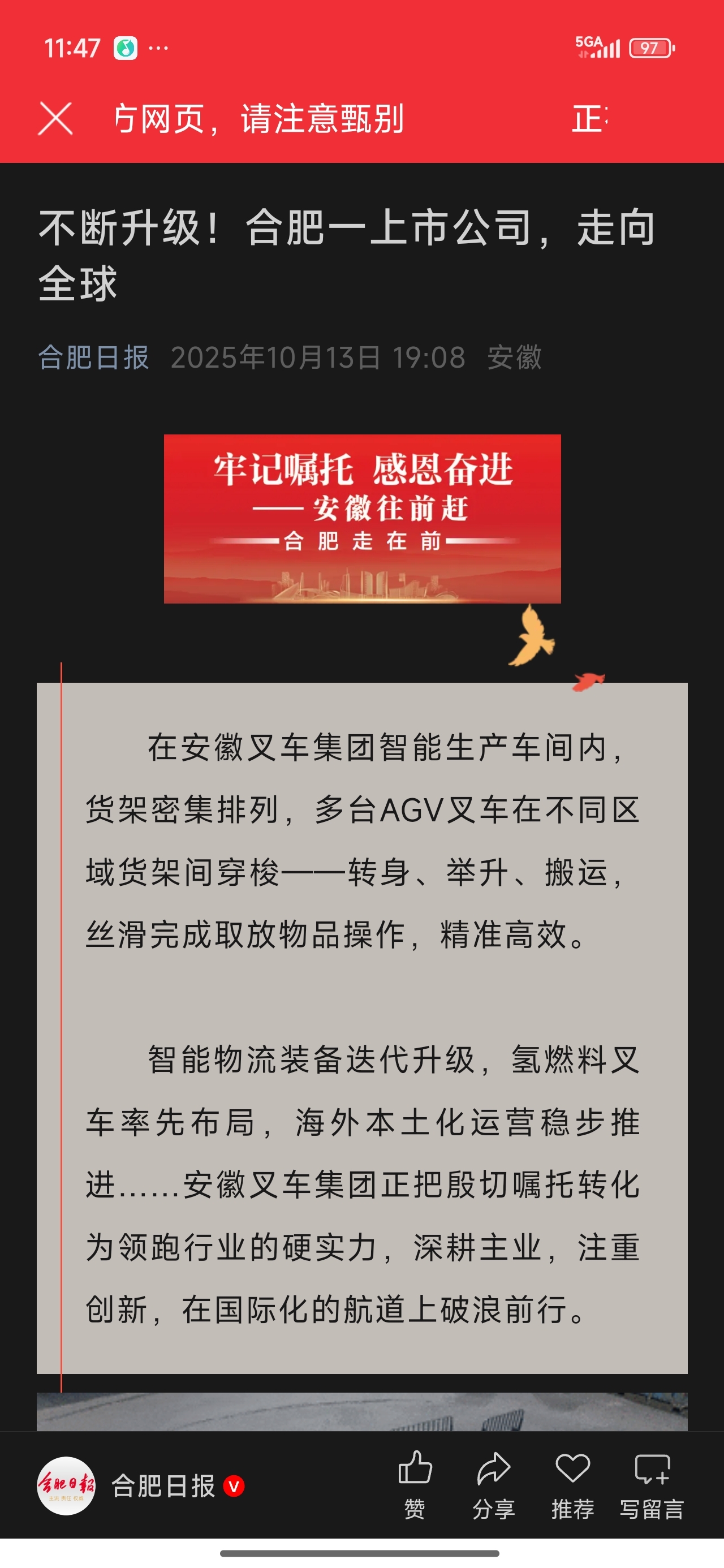 $安徽合力(SH600761)$ 合肥日报头版头条