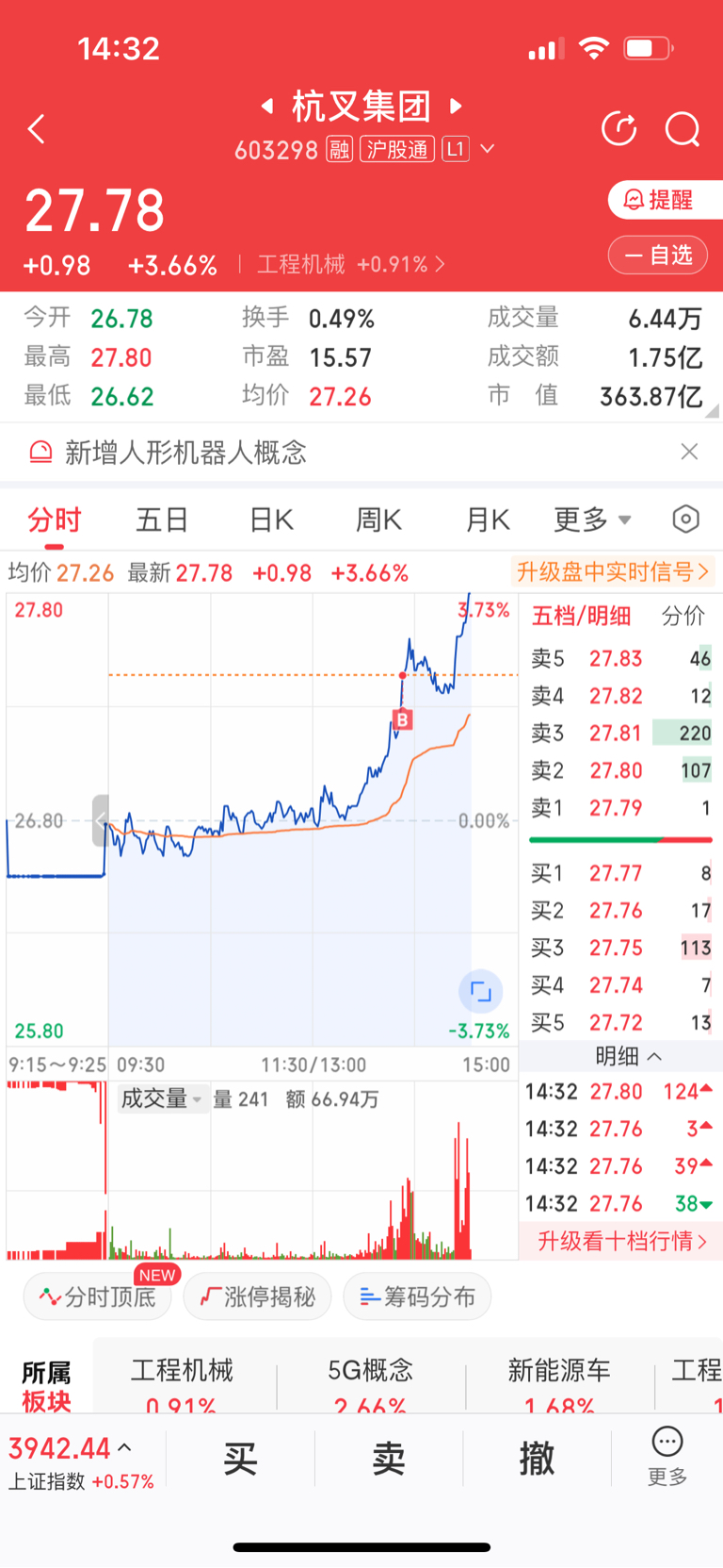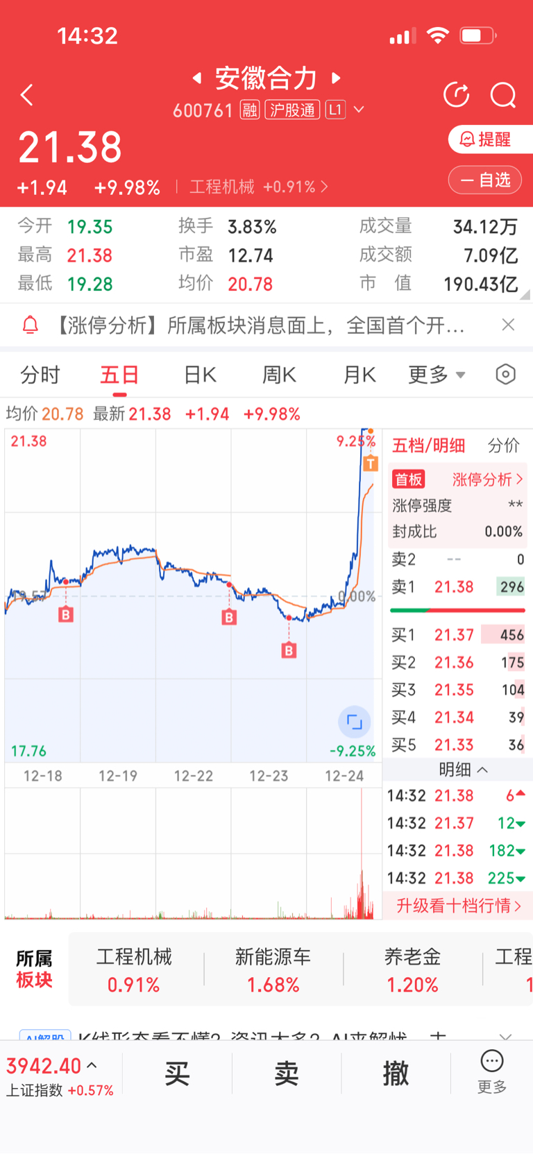$安徽合力(SH600761)$ $杭叉集团(SH603298)$ 挂了一单涨停买单,2分钟就成交了。全清掉了,我去杭叉入一点。