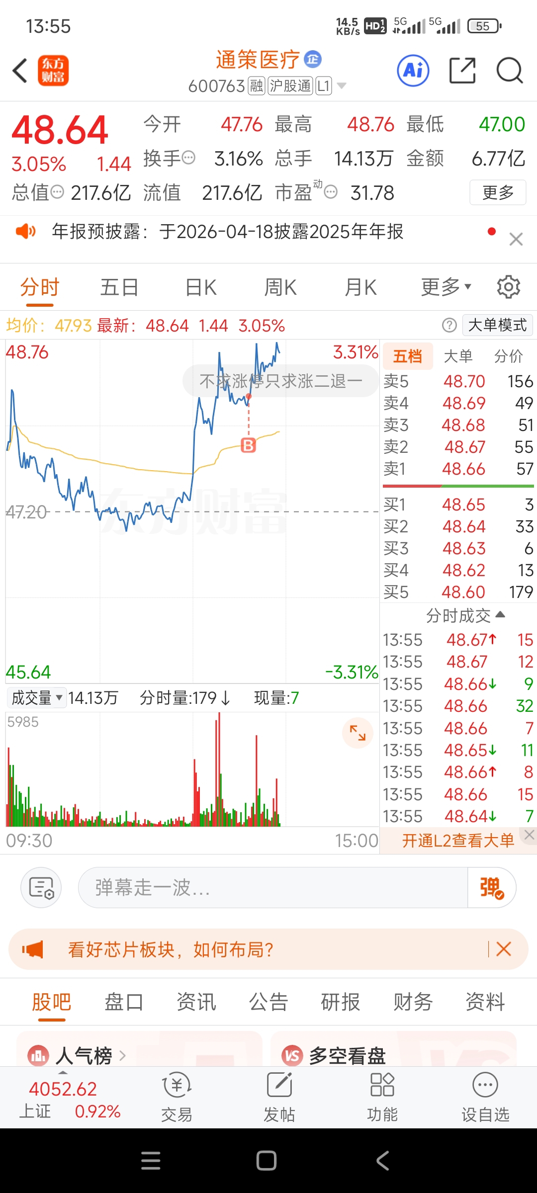 仓位0.5,成本48.25。买入逻辑:短线图形追涨。放量新高,突破平台。预期:连