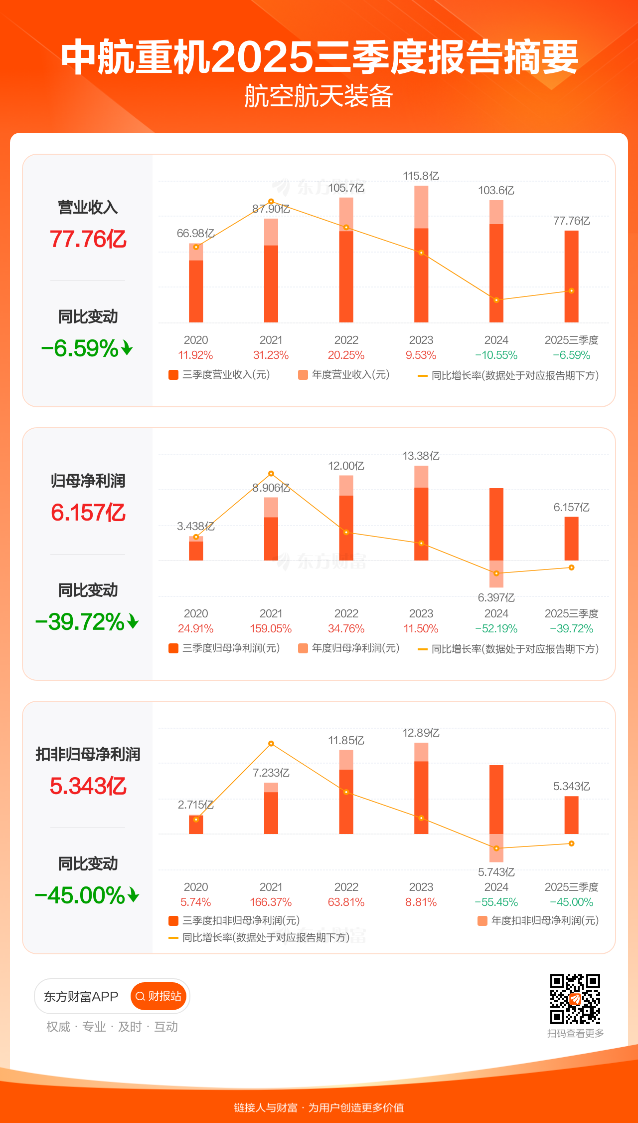 中航重机10月31日发布2025年三季报显示,公司前三季实现营业收入77.76亿元,同比下滑6.59%;归母净利润6.16亿元,同比下滑39.72%;扣非归母净利润5.34亿元,同比下滑45.00%。