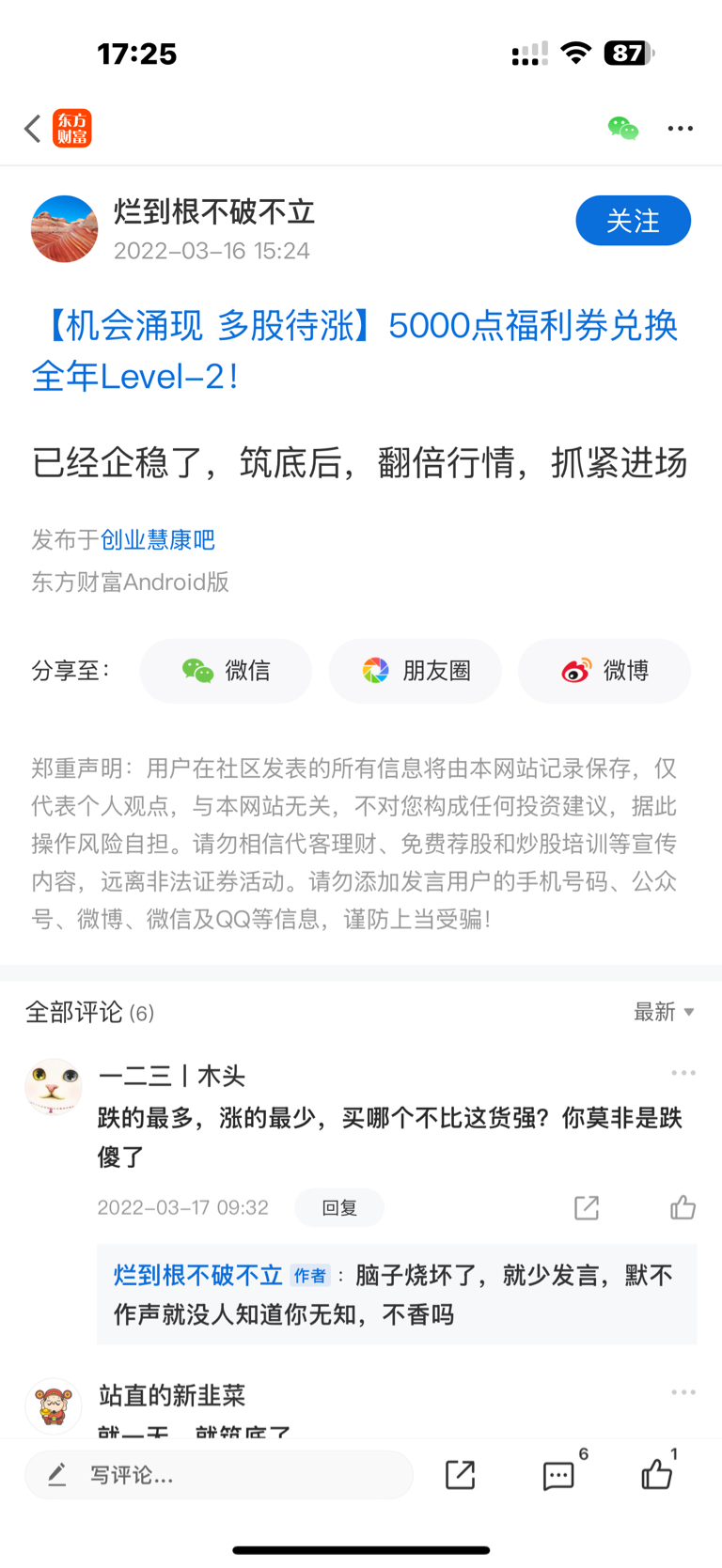 温馨提示: 1.根据《证券法》规定,禁止编造、传播虚假信息或者误导性信息,扰乱证券市场;2.用户在本社区发表的所有资料、言论等仅代表个人观点,与本网站立场无关,不对您构成任何投资建议。用户应基于自己的独立判断,自行决定证券投资并承担相应风险。《东方财富社区管理规定》