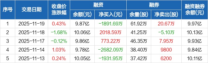 融资方面,当日融资买入2943.22万元,融资偿还4834.91万元,融资净偿还1891.69万元。融券方面,融券卖出21.32万股,融券偿还6500股,融券余量61.92万股,融券余额1021.09万元。融资融券余额合计9.97亿元。