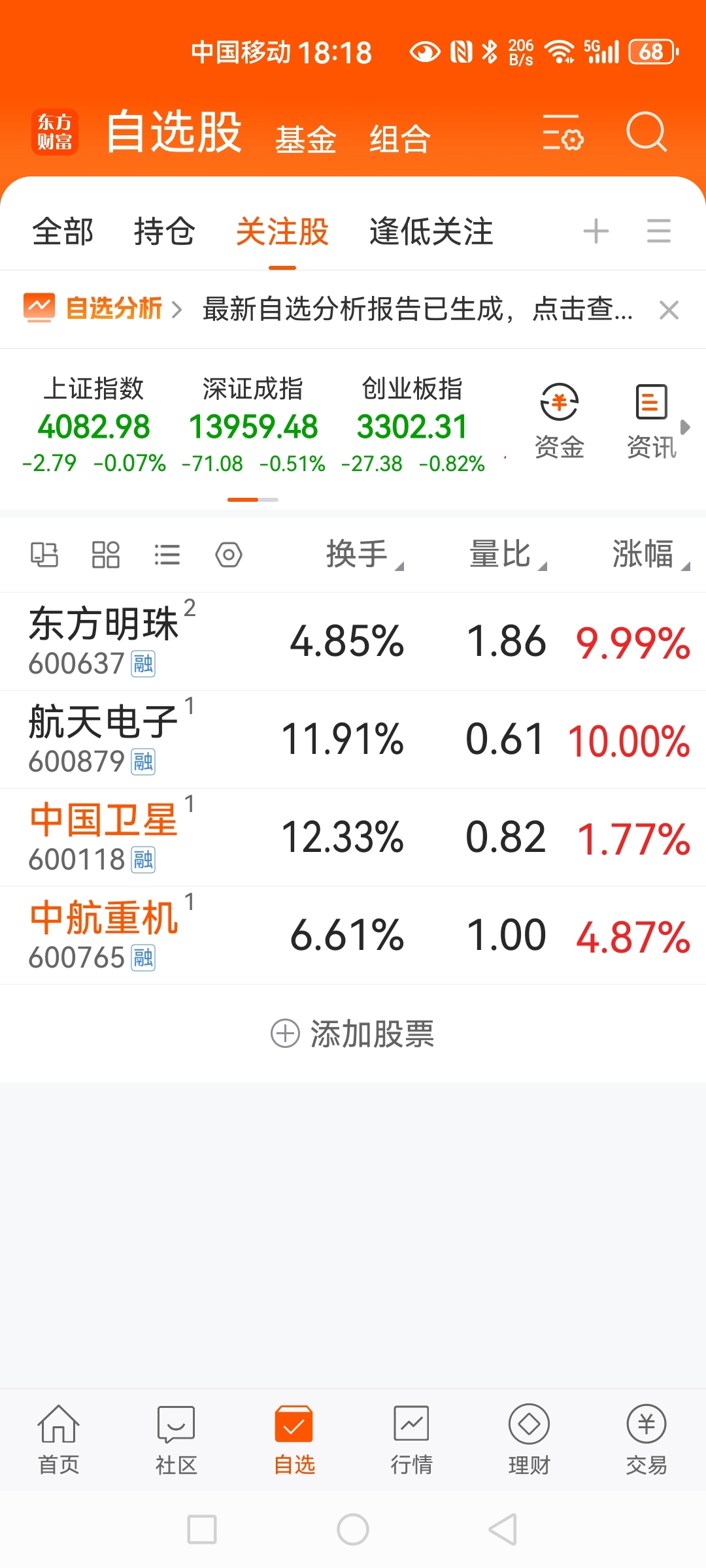 $中航重机(SH600765)$ 昨晚挑了这四个,本打算今早等中核科技和航天发展涨点后马上卖了买航天电子和中航重机,再从中国卫星和东方明珠中挑一个,结果早上航天发展低开后慢爬,中核科技慢慢爬着还掉下来了,完美错过了航天电子,看来涨势不太好的得果断干掉,亏点也无所谓。