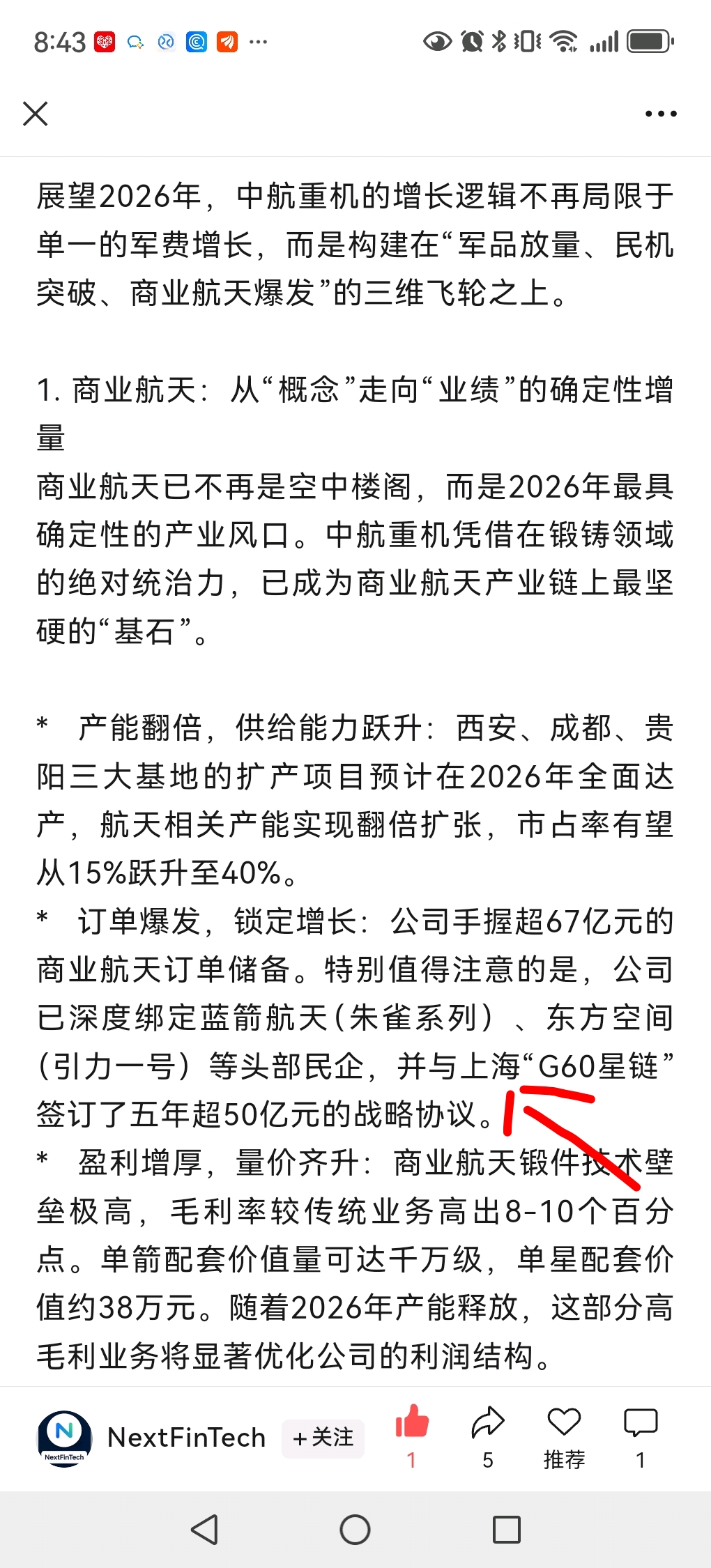 $中航重机(SH600765)$ 中航重机公司手握超67亿元的商业航天订单储备。特别值得注意的是,公司已深度绑定蓝箭航天(朱雀系列)、东方空间(引力一号)等头部民企,并与上海“G60星链”签订了五年超50亿元的战略协议。