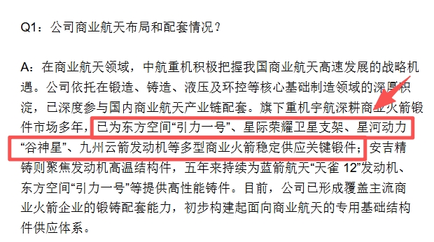 中航重机已为东方空间“引力一号”、星际荣耀卫星支架、星河动力“谷神星”、九州云箭