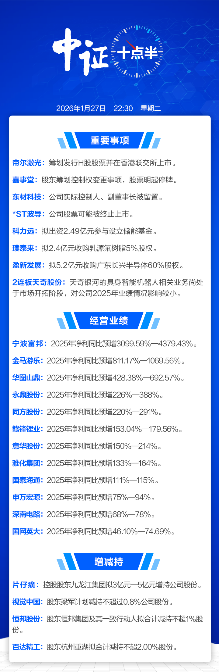 【中证十点半】宁波富邦2025年净利润预增超30倍;帝尔激光拟赴港上市;东材科技副董事长被留置