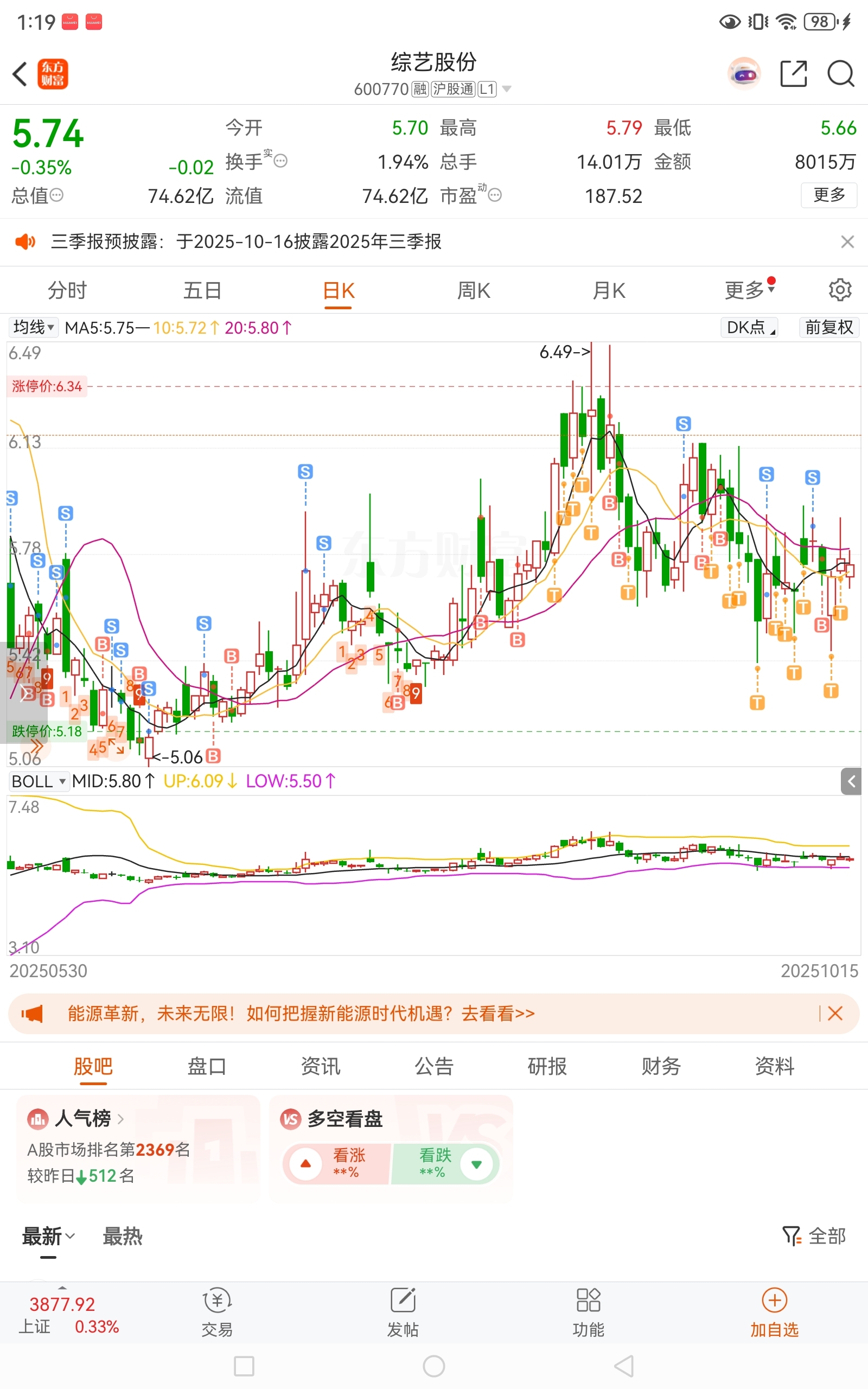 $综艺股份(SH600770)$ 今天居然不给T的机会?