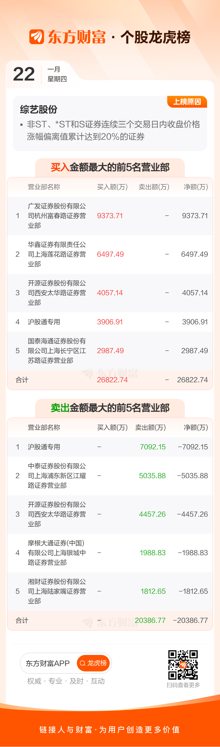 交易所2026年1月22日公布的交易公开信息显示,综艺股份因成为非ST、*ST和S证券连续三个交易日内收盘价格涨幅偏离值累计达到20%的证券上榜。综艺股份当日收报6.8元,涨跌幅10.03%,换手率13.79%,成交额12.03亿。异常期间1月21日至1月22日,期间涨幅21.00%,累计偏离值20.78%,区间成交额17.30亿。