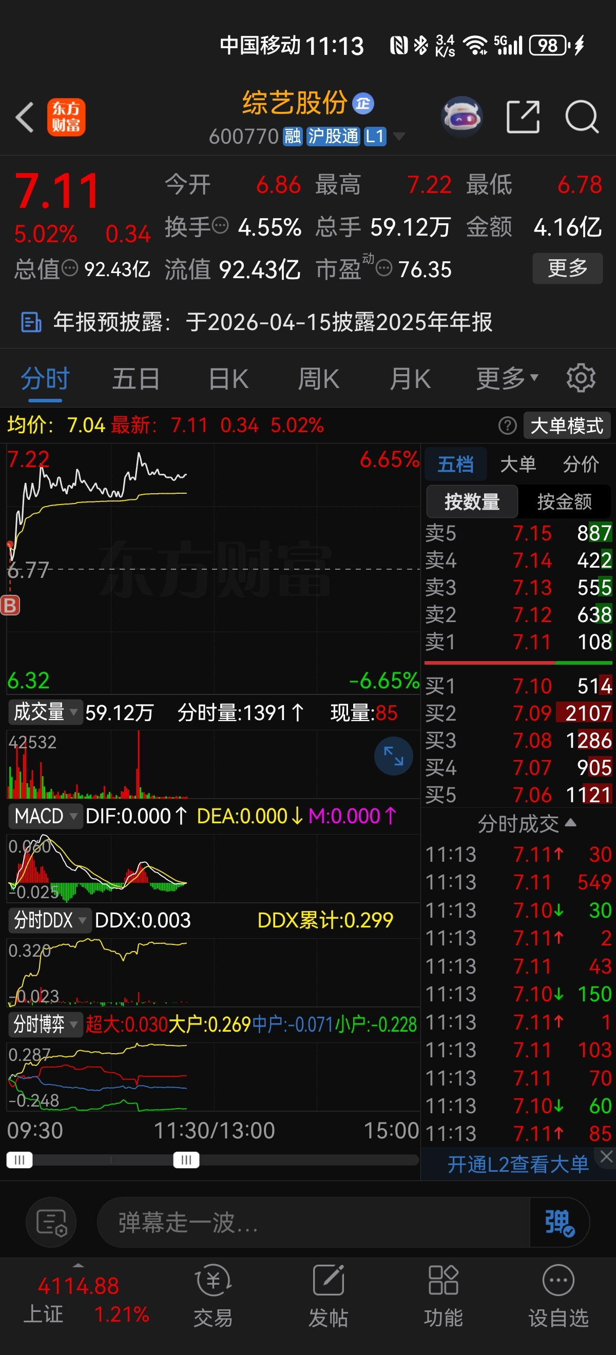 $综艺股份(SH600770)$ 综艺股份,今天正式告别6元时代,进入7元时代了。