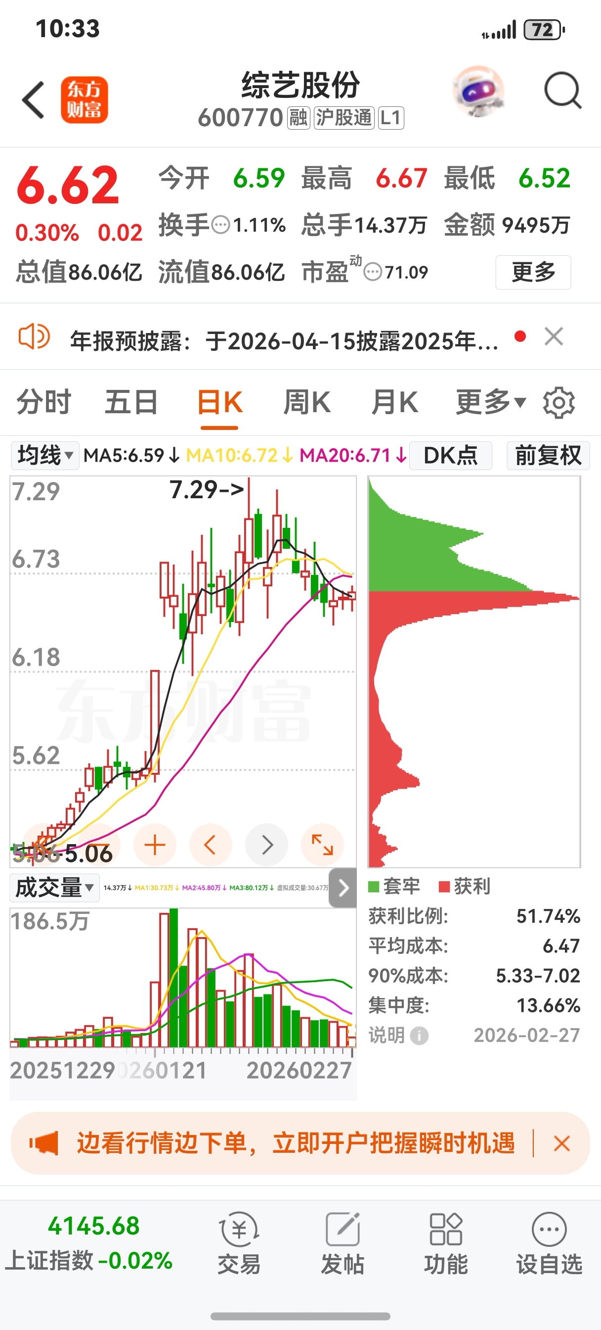 $综艺股份(SH600770)$ 此票自4块多实破6.5的箱顶后,试探性的攻击7.5未果,回落于6.5附近,换手堆积了很大的量,形成了一个较为坚实的地部。耐心等待吧从月线上看近2个月内很有可能摸高到8块。