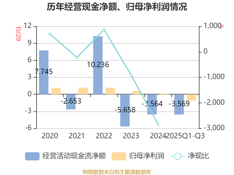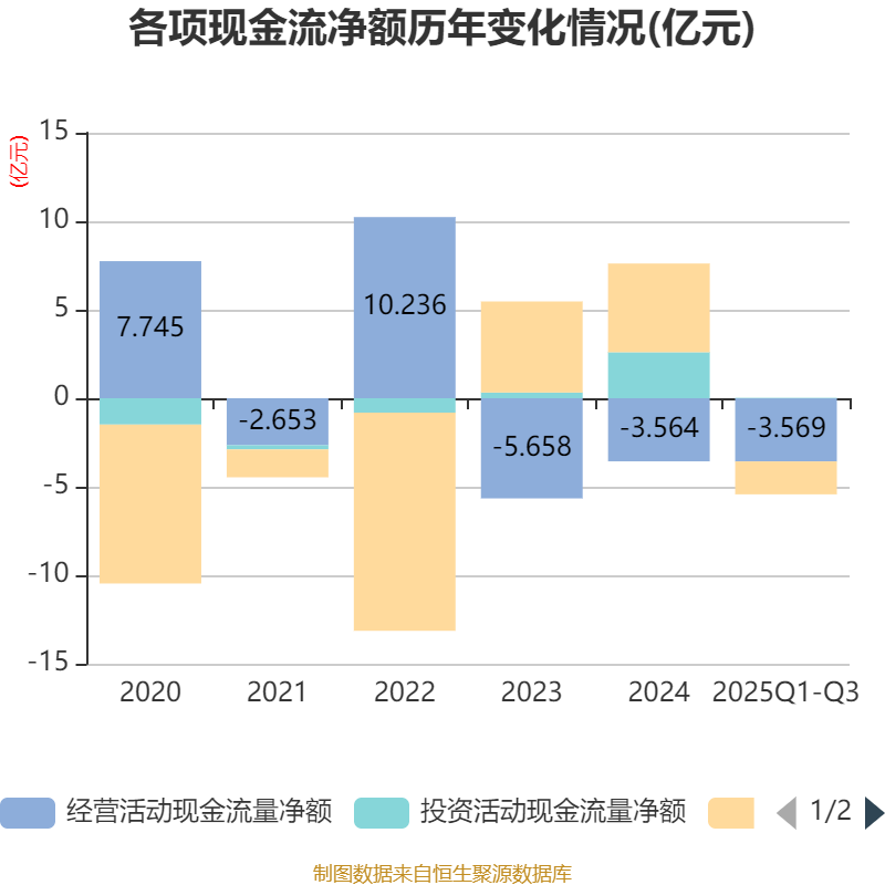 2025年前三季度,公司经营活动现金流净额为-3.57亿元,同比增加4.67亿元;筹资活动现金流净额-1.86亿元,同比减少13.51亿元;投资活动现金流净额307.74万元,上年同期为947.51万元。