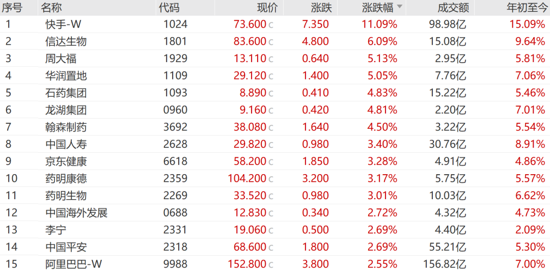 成交额突出个股方面,阿里巴巴成交额达156.82亿港元,上涨2.55%;腾讯控股成交额为124.50亿港元,微涨0.24%;中芯国际成交额为99.56亿港元,上涨1.86%。