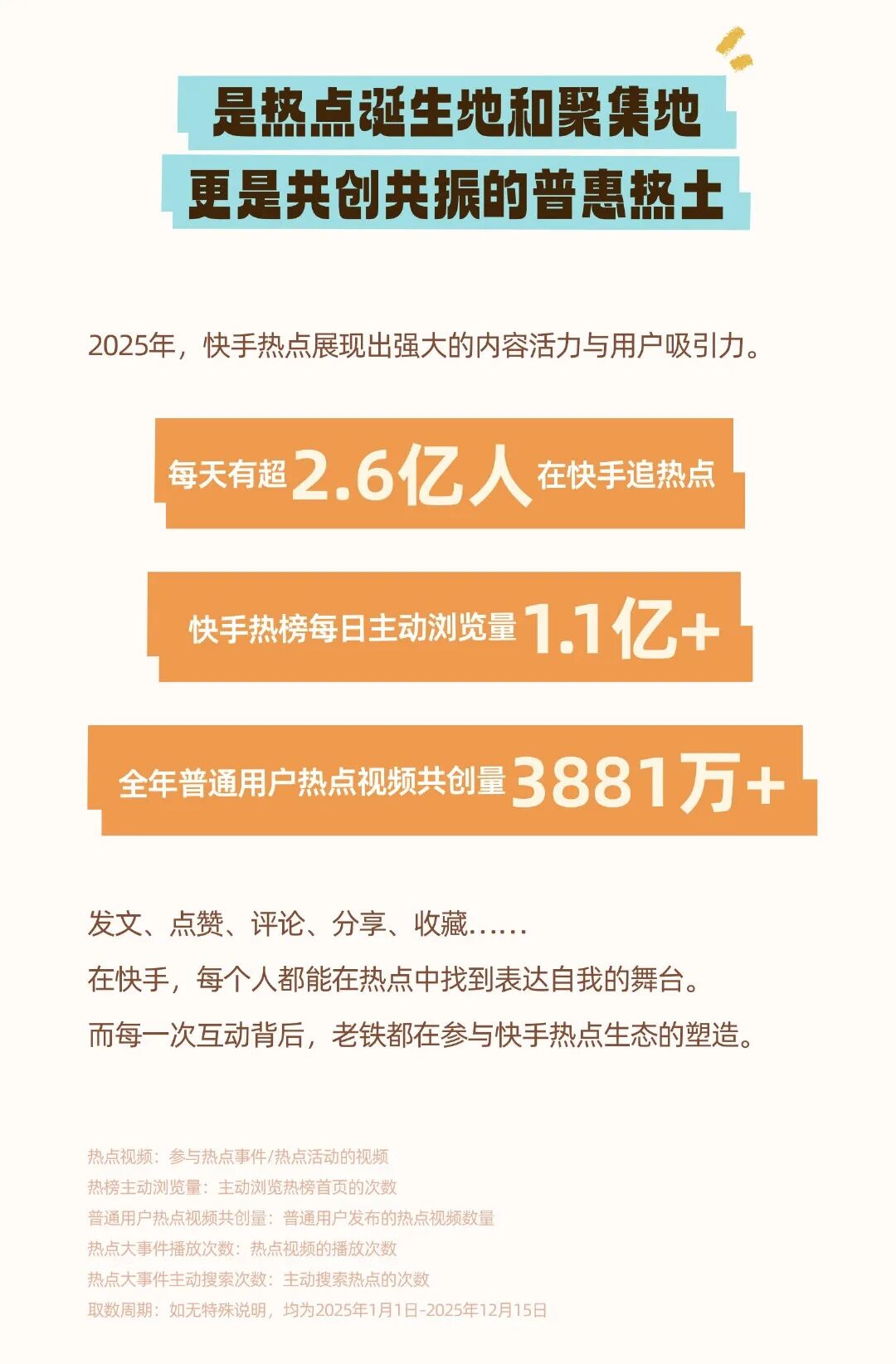 1月5日,快手发布首份《2025快手热点年度趋势报告》。报告显示,平台日均有2.6亿用户追热点,热榜日主动浏览量达1.1亿次,全年由普通用户共创的热点视频超3881万条。