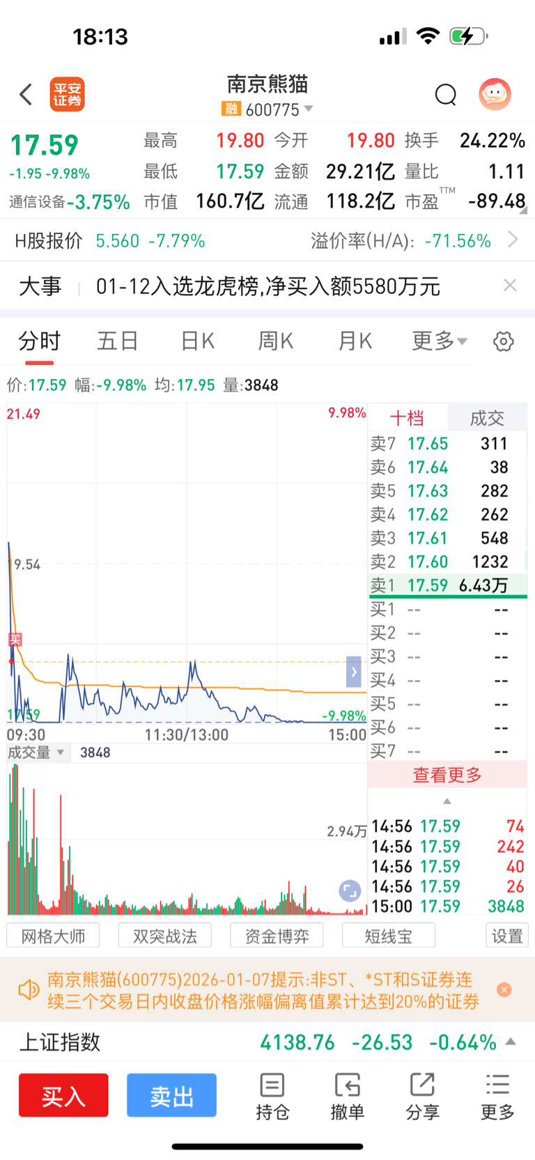 $南京熊猫(SH600775)$ 朋友说强者恒强,让我去买,结果………………挂上了,明天不要锁门就行了