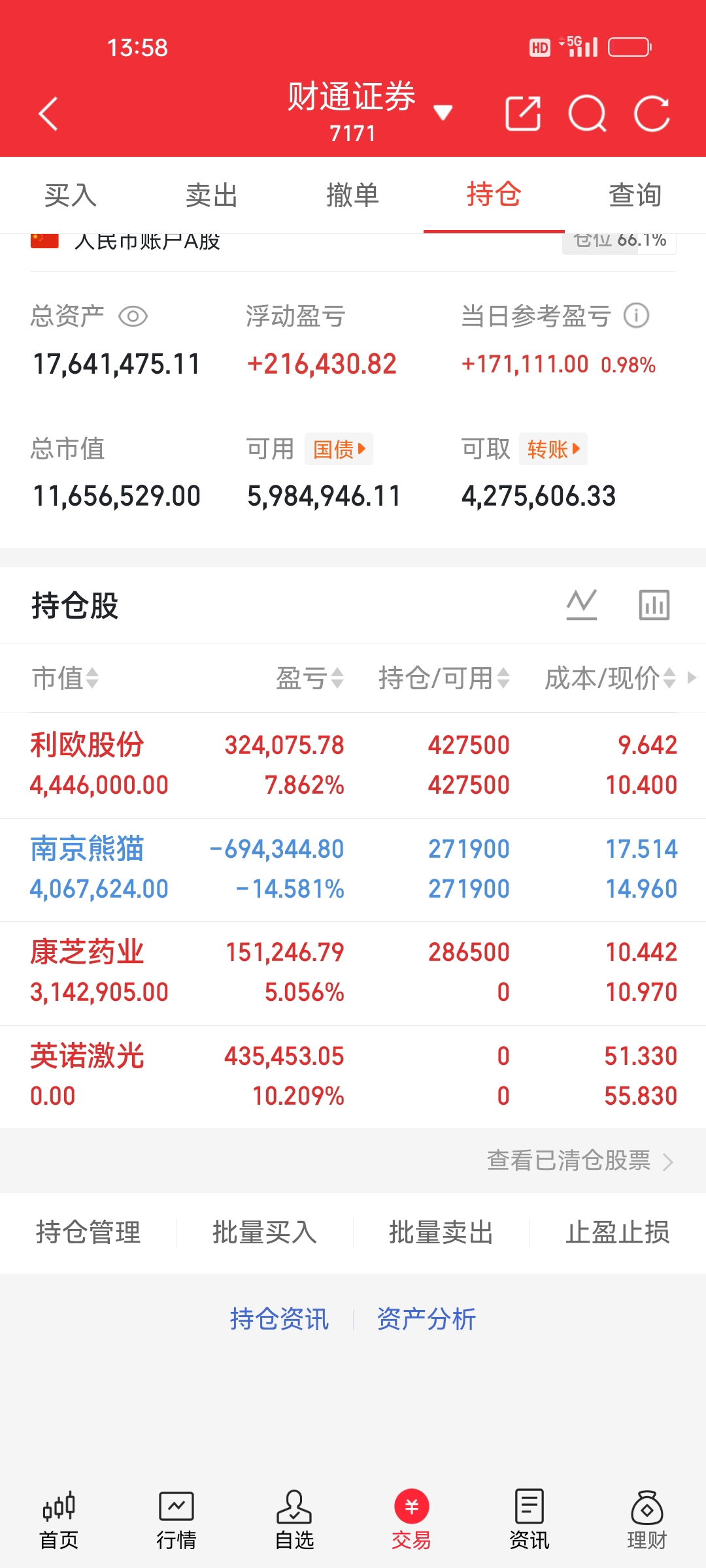 卖出英诺激光,小赚离场落袋为安;持仓$南京熊猫(SH600775)$ $利欧股份(SZ002131)$ ,持股待涨看后续;新入$康芝药业(SZ300086)$ ,静待行情发酵。