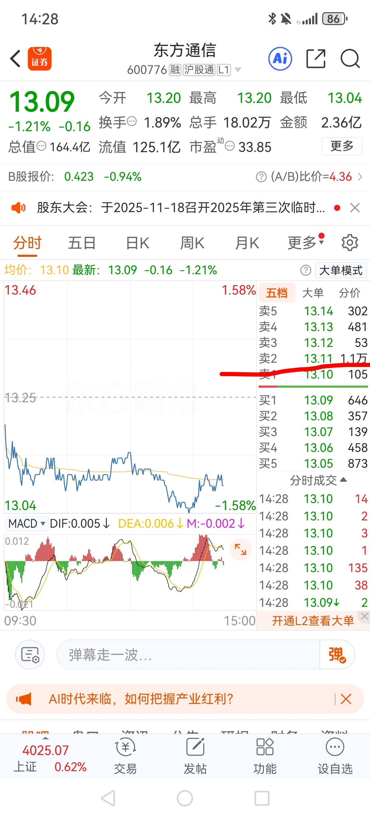 $东方通信(SH600776)$ 和昨天套路一样,在13.11压着。不让上去。昨天压在13.09。