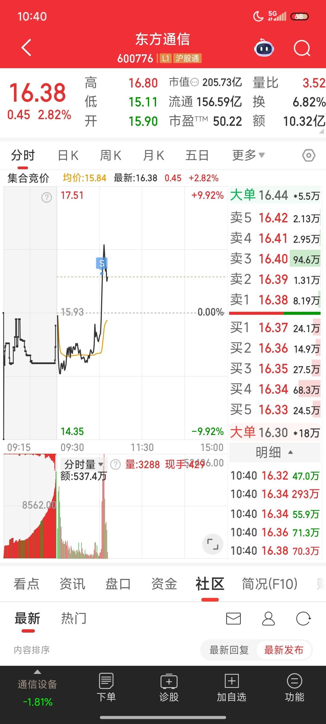 $东方通信(SH600776)$ 一个电话没来的急撤单,但是赚了,走了,真磨人