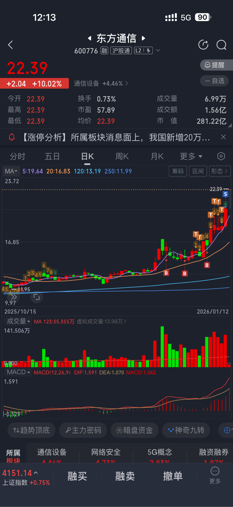 $东方通信(SH600776)$ 糙,看好月线可以持有一段时间,周五被洗出去了