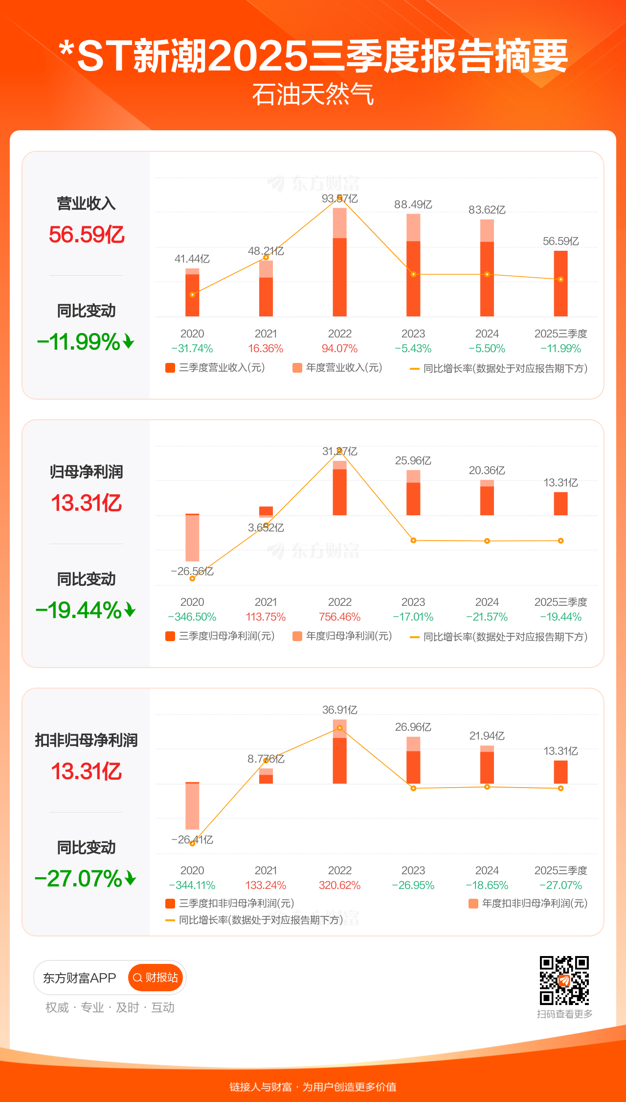 *ST新潮10月31日发布2025年三季报显示,公司前三季实现营业收入56.59亿元,同比下滑11.99%;归母净利润13.31亿元,同比下滑19.44%;扣非归母净利润13.31亿元,同比下滑27.07%。