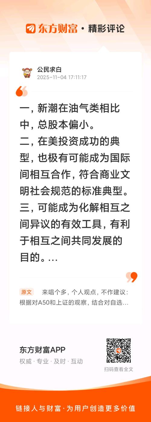 //@公民求白 :一,新潮在油气类相比中,总股本偏小。二,在美投资成功的典型,也极有可能成为国际间相互合作,符合商业文明社会规范的标准典型。三,可能成为化解相互之间异议的有效工具,有利于相互之间共同发展的目的。四,便宜。
