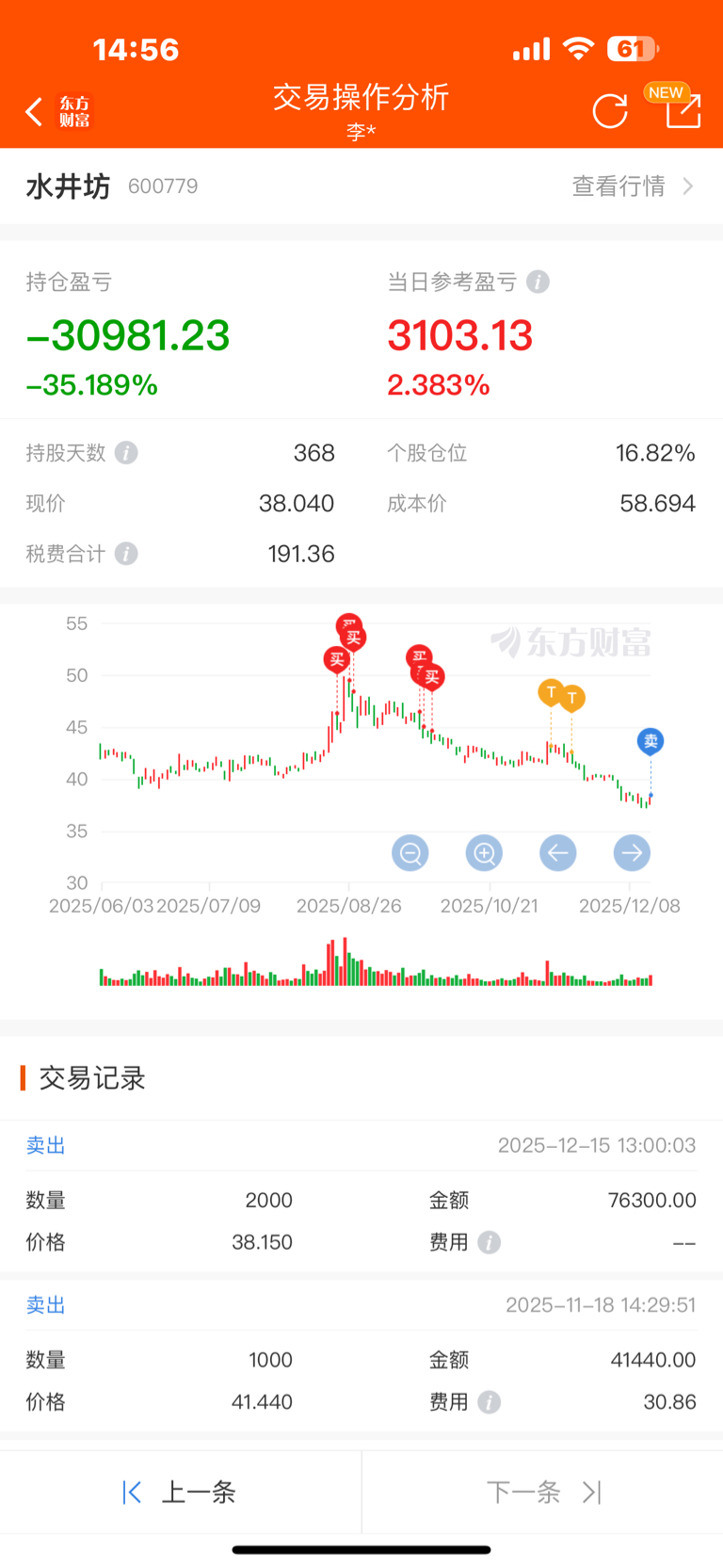 $水井坊(SH600779)$ 我割了 你可以涨了 #炒股日记#