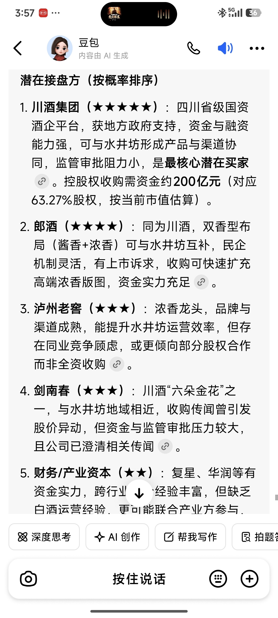 $水井坊(SH600779)$ 可能是谁,接盘。人工智能评估,每股65元出售概率大。别指望二级市场收购,外资拿百分之70的股权。外资不退出,没人可以收。
