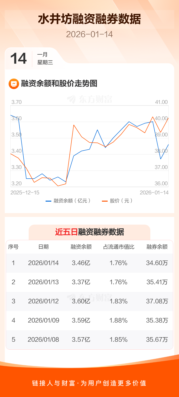 交易所最新数据显示,水井坊于2026年1月14日获融资买入5723.48万元,融资偿还4844.56万元,当日融资净买入878.92万元。目前,该股融资余额3.46亿,占流通市值比例为1.76%。