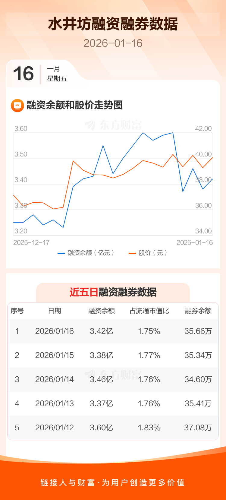 交易所最新数据显示,水井坊于2026年1月16日获融资买入3764.66万元,融资偿还3353.58万元,当日融资净买入411.08万元。目前,该股融资余额3.42亿,占流通市值比例为1.75%。