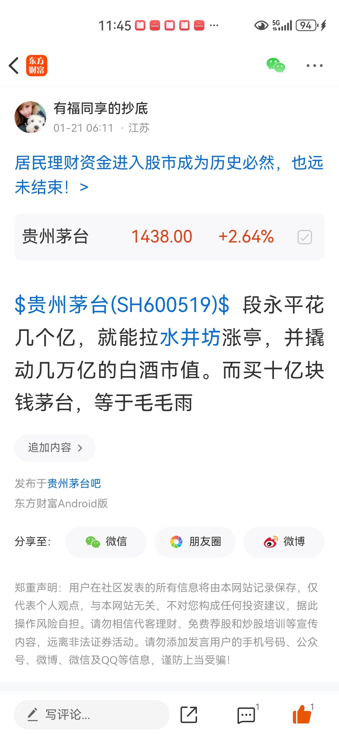 温馨提示: 1.根据《证券法》规定,禁止编造、传播虚假信息或者误导性信息,扰乱证券市场;2.用户在本社区发表的所有资料、言论等仅代表个人观点,与本网站立场无关,不对您构成任何投资建议。用户应基于自己的独立判断,自行决定证券投资并承担相应风险。《东方财富社区管理规定》