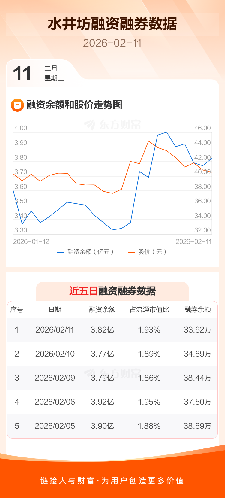 交易所最新数据显示,水井坊于2026年2月11日获融资买入2451.89万元,融资偿还1939.08万元,当日融资净买入512.81万元。目前,该股融资余额3.82亿,占流通市值比例为1.93%。