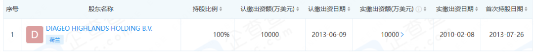 企查查显示,帝亚吉欧旗下企业Diageo Highlands Holding B.V.对水井坊第一大股东——四川成都水井坊集团有限公司,实现100%控股,因此成为水井坊实际控制人。