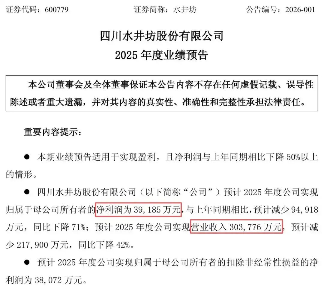 值得关注的是,帝亚吉欧的白酒业务主要依托水井坊借势展开。水井坊2025年度业绩预告显示,其预计实现归母净利润3.92亿元,同比下降71%;预计实现营业收入30.38亿元,同比下降42%。不仅较此前机构预测净利润均值偏差超过40%,其营收规模、盈利能力更是大幅缩水。