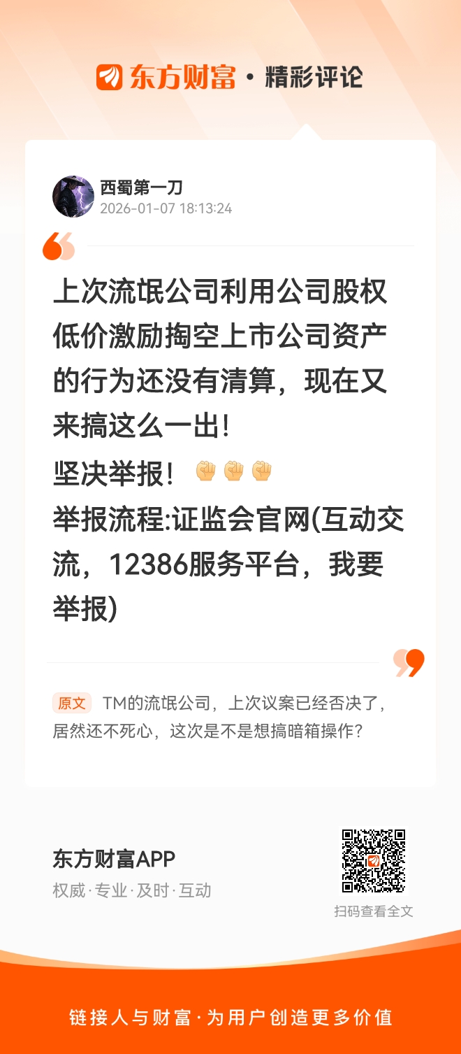 上次流氓公司利用公司股权低价激励掏空上市公司资产的行为还没有清算,现在又来搞这么一出!坚决举报!举报流程:证监会官网(互动交流,12386服务平台,我要举报) 我在《TM的流氓公司,上次议案已经否决了,居然还不死心,这次是不是想搞暗箱操作?》的评论获得了大家的关注。