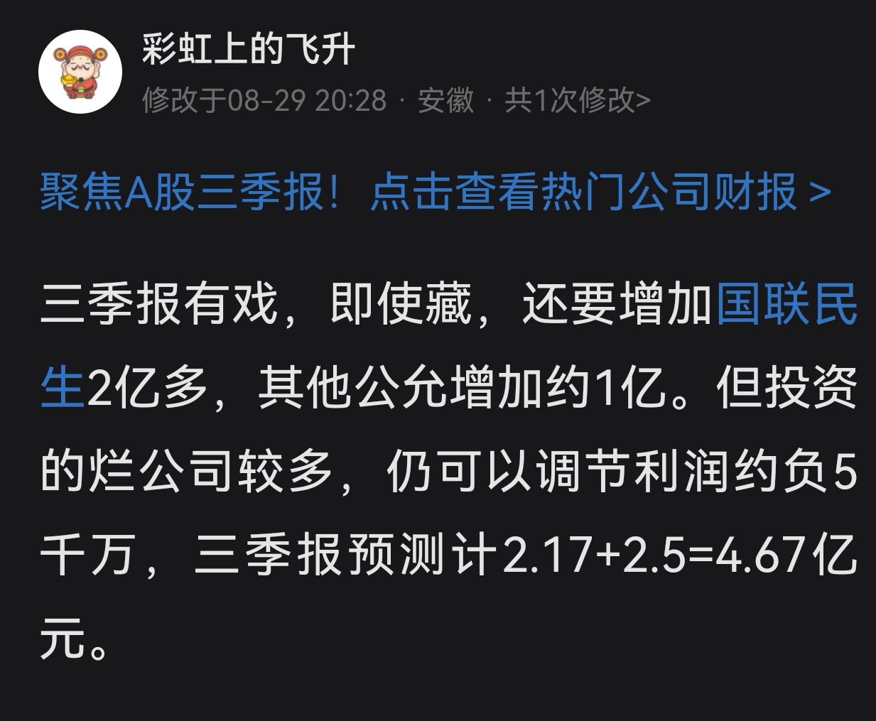 $鲁信创投(SH600783)$ 三季度国联民生8月份预计赚2亿,9月底却只赚0.8亿,应减计1.2亿,没想到。本人预测净利润4.6亿减1.2亿=3.4亿,与发布的净利润基本一致,一切尽在掌握中。