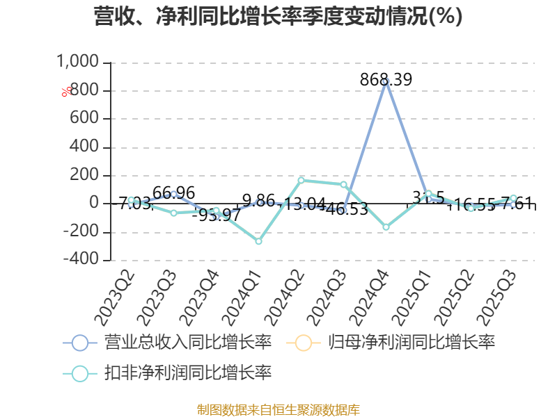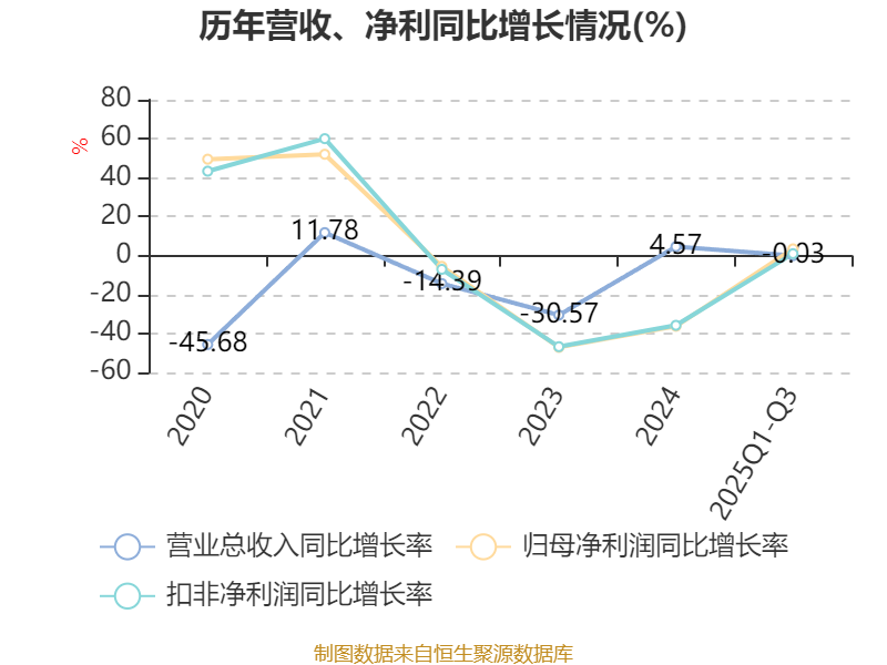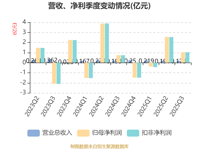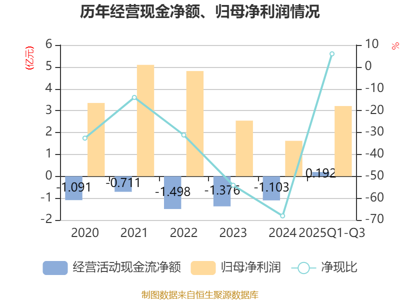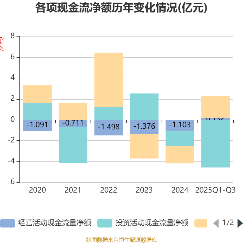 2025年前三季度,公司经营活动现金流净额为1916.5万元,同比增加2994.92万元;筹资活动现金流净额2.1亿元,同比增加4.46亿元;投资活动现金流净额-4.58亿元,上年同期为1.02亿元。