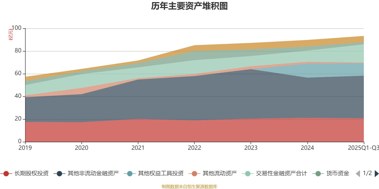 资产重大变化方面,截至2025年三季度末,公司交易性金融资产合计较上年末增加63.7%,占公司总资产比重上升6.29个百分点;其他权益工具投资较上年末减少11.48%,占公司总资产比重下降2.06个百分点;货币资金较上年末减少48.33%,占公司总资产比重下降2.05个百分点;长期股权投资较上年末减少1.99%,占公司总资产比重下降1.34个百分点。